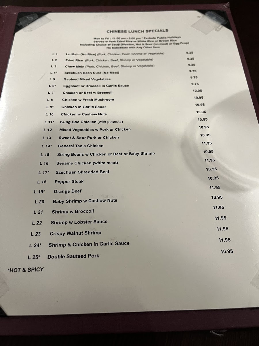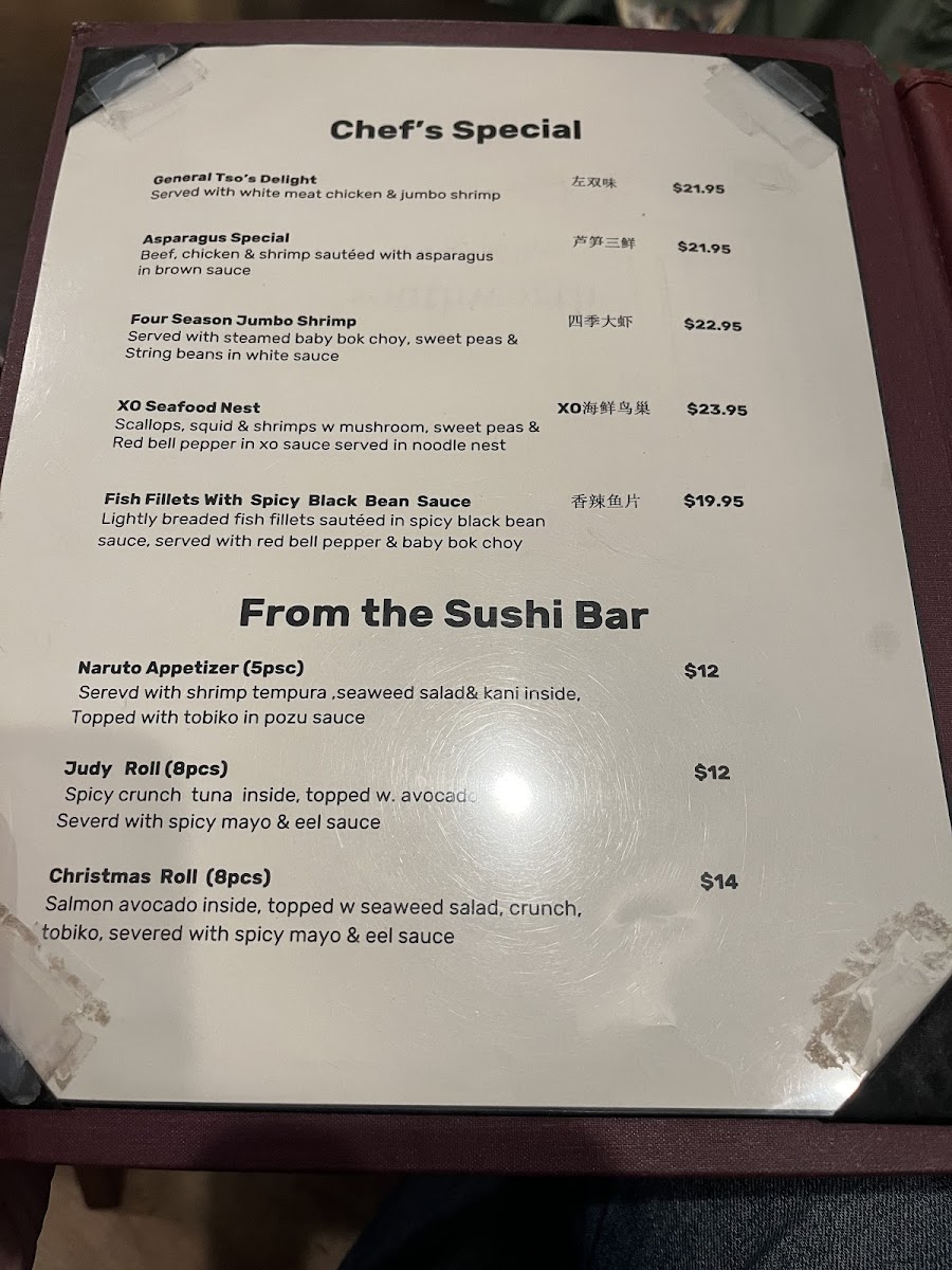Guests can enjoy comforting options like savory pork fried rice, chicken and broccoli in garlic sauce, or a warming mixed wonton and egg drop soup. For those seeking lighter, fresher tastes, the sushi platters and rolls such as the Mango Tango Roll offer a delicate contrast with vibrant seafood and crisp vegetables. Vegetable-forward dishes like sautéed baby bok choy and steamed spinach provide fresh, simple accompaniments suitable for any meal.